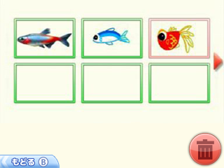 CahiEr~飼い絵~は、水そうのなかの世界を、絵を描いて自由な世界を作り出すことのできるソフトです。 お絵かきの画面では、15色のクレヨンや 色えんぴつで自由に絵をかくことができます。スケッチブックはぜんぶで6さつ。さかなの他にも はいけいやオブジェの絵を描いたり、はいけい用の写真の さつえいもできます。 スケッチブックから 水そうへ、絵を入れたり出したりできます。その他にも、絵のコピーや描いたえのつづきから描くことができる画面です。※さかなは全部で15匹(15種類)まで入れることができます。※はいけいやオブジェを入れるときには、水そうに入っている絵を出してから入れることができます。 スケッチブックが いっぱいになってしまうと、あたらしい絵をほぞんすることができなくなります。ふるい絵や もういらないと思う絵を、さくじょする画面です。 水そうのさかなを、お世話する画面です。えさを1回いれると3匹のさかなが、えさを食べることができます。ふつうのえさだと、おなかがすくまで 次のえさを食べません。おいしいえさは、おなかがすいていなくても食べます。さかなはえさを食べると、おれいにコインを 生んでくれます。せんすいかんをそうさして、うまくコインを キャッチしましょう。 ためたコインをつかって、アイテムを買うことが できます。ここでスケッチブックも 買うことができます。スケッチブックは 1つのしゅるいを 1さつまで買えます。 すれちがい通信でやってきた、見学者のようすを 見ることのできる画面です。1人からコインを一枚、見学料として もらうことができます。 ソフト内容に関するお問い合わせ 【ユーザーサポート窓口】 電話番号:011-842-7328 受付時間:10時~12時 13時~14時 土日祝祭日および弊社指定休業日を除く